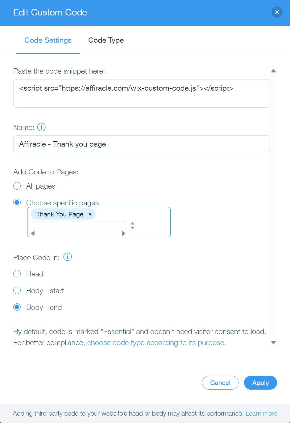 <script src="https://affiracle.com/wix-custom-code.js"></script>- שם הקוד: Affiracle Embed - Thank You Page